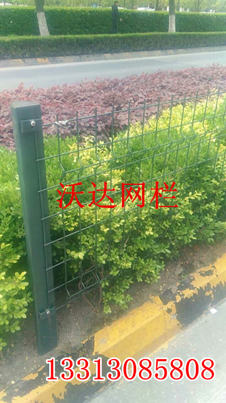 綠化帶D型柱隔離網應用在綠化帶兩側隔離,防止人和動物穿越道路,D型柱隔離網立柱規格:80X66x2.0mm,無縫異型管制作,截面呈梯形結構(D型管)厚度2.0mm,管體內外采用熱鍍鋅處理,鋅量不少于270g/㎡.網片采用5.0mm絲直徑,網孔6x12cm,表面噴塑處理。